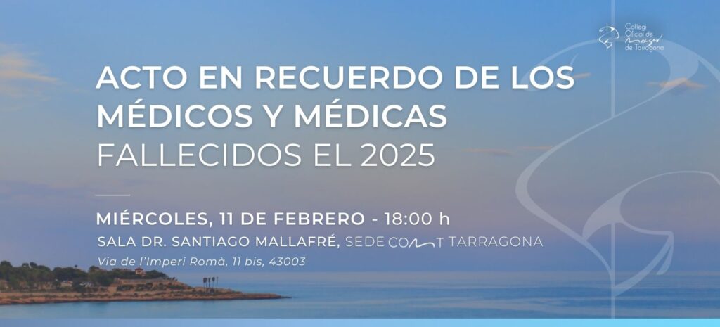 El próximo miércoles 11 de febrero, a las 18:00 horas, el Colegio Oficial de Médicos de Tarragona celebrará el acto en recuerdo de los médicos y médicas que nos han dejado durante el año 2025. El evento tendrá lugar en la Sala Doctor Santiago Mallafré de la sede colegial.