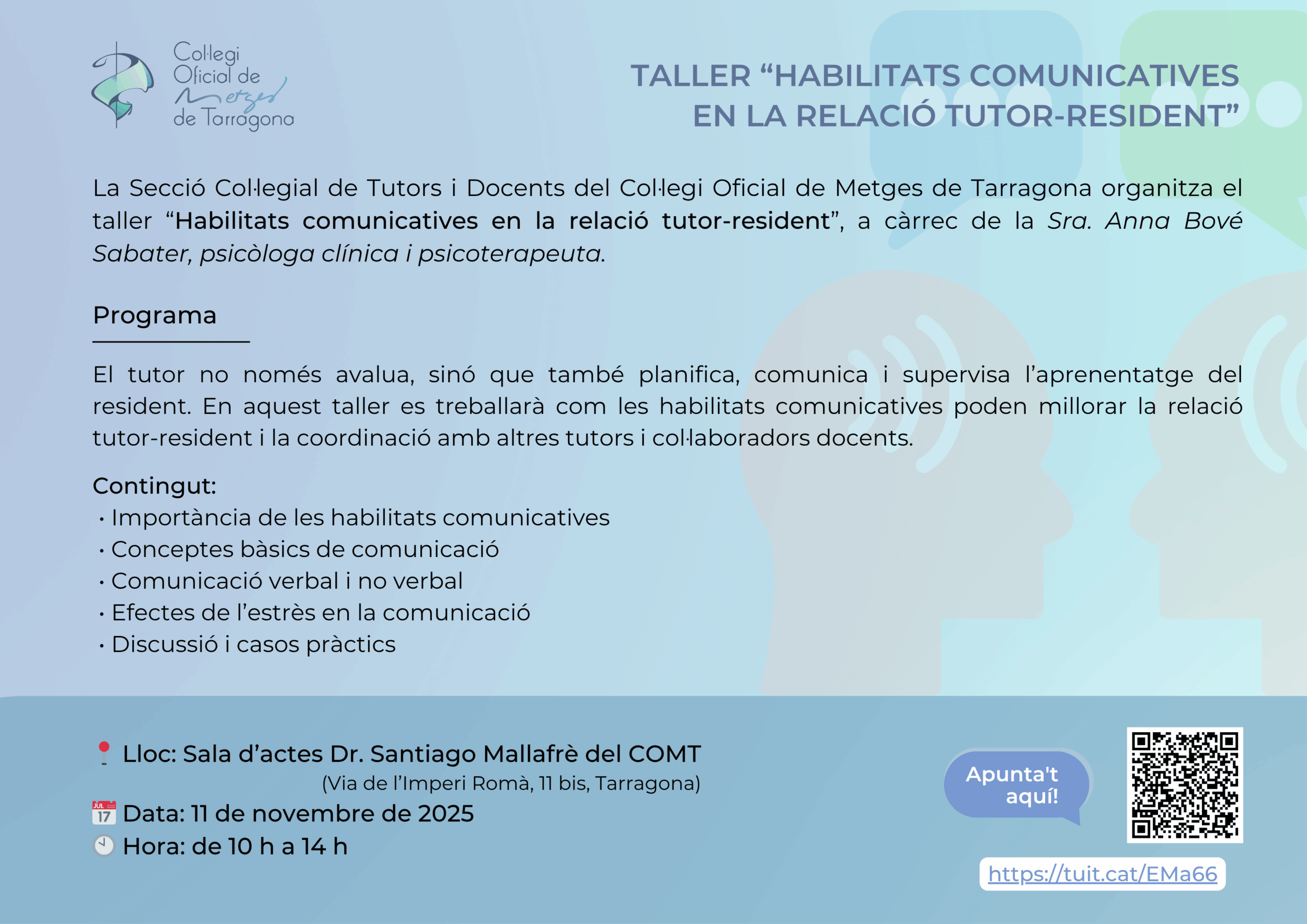 La Sección Colegial de Tutores y Docentes del Colegio Oficial de Médicos de Tarragona (COMT) ha celebrado hoy, 11 de noviembre de 2025, el taller “Habilidades comunicativas en la relación tutor-residente”, a cargo de la Sra. Anna Bové Sabater, psicóloga clínica y psicoterapeuta.