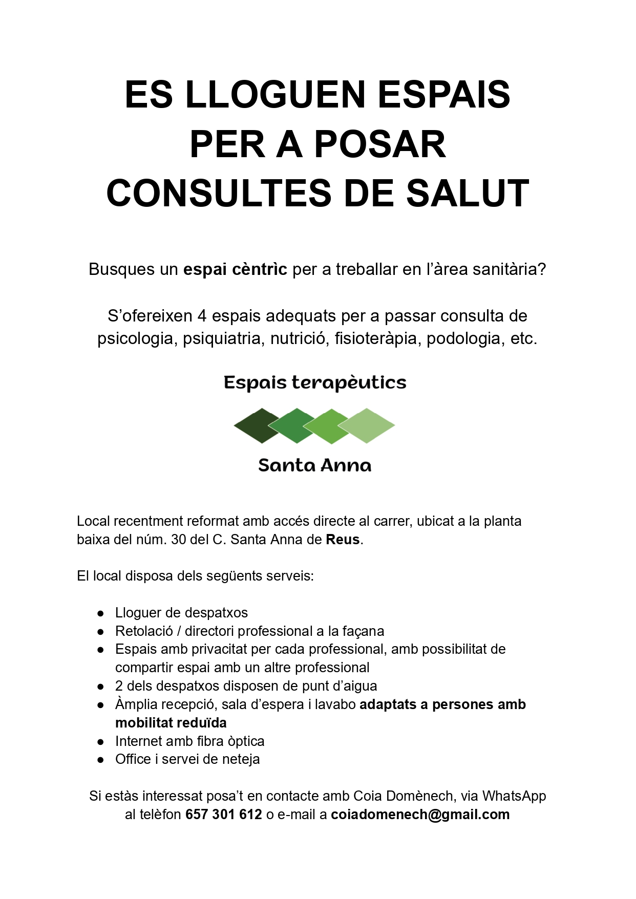 Llogo un espai terapèutic per Consulta mèdica en un local molt cèntric a Reus.